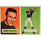 Key 1957 Topps Football rookie cards are Bart Starr (#119), Johnny Unitas (#138) and Paul Hornung (#151). Other major players appearing for the first time include Dick "Night Train" Lane (#85), Tommy McDonald (#124), Raymond Berry (#94) and Earl Morrall (#104). Collectors often contemplate what this set might have been like had Topps used all of the eligible rookies who had been drafted in the fall of the previous year. Missing from the set are a handful of future Hall of Famers, most notably Len Dawson and Jim Brown.