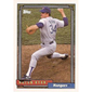 The 792-card 1992 Topps Baseball checklist includes a handful of subsets including Draft Picks, Managers, All-Stars, Record Breakers and Prospects, which have four players. Card fronts have a white border. A small frame overlaps the image. The player's name and team hover in separate boxes at the bottom of the card.