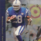 The 200-card checklist kicks off with 20 Premier Prospects, rookie cards from the game's top first-year players. Leading the way is Marshall Faulk. From there, it's a steep drop with Trent Dilfer and Heath Shuler leading the second-tier rookies. Premier Prospects have a different design. They use an upgraded etched foil background. A subset foil logo in in the bottom-right corner. A solid-colored stripe in the top-left has the player's name and team. A dotted line leads to a small circle with the position.