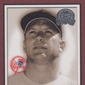 The 2000 Fleer Greats of the Game Baseball base set is rather small at just 107 cards. The simple design evokes a strong sense of nostalgia. Brown borders give way to a simple player photo. A silver foil brand logo is at the top of the card while a team logo floats in the middle, the only element that may seem out of place. The photo fades out at the bottom, giving way to the player's name and team. The end result is a card front that emphasizes a refreshing amount of white space.