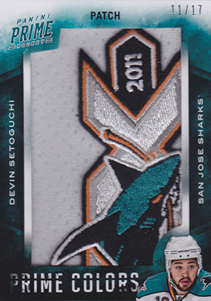 2013-14 Panini Prime Hockey Prime Colors cards come in several different varieties. When combined, they make for a massive checklist. Veterans have logo, patch and letters versions, each with more than 120 cards each. On top of those, there are 25 additional logo and patch cards highlighting rookies.