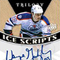 Signature Pucks use a puck face as the signing surface. Besides basic versions, Trilogy also has rare Retro Logo (#/13) and Shield Logo (#/3) cards.