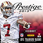 2013 Prestige Football has some of the first rookie cards of the year. Top players participating in the NFL PLAYERS Rookie Premiere are pictured on football cards in their NFL uniforms for one of the first times as well. Hobby boxes come with a total of four hits, including at least two autographs.