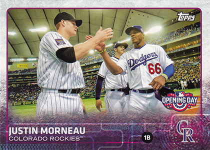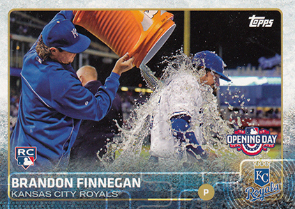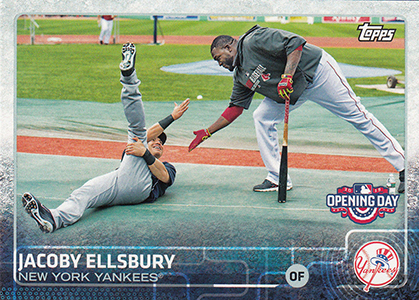 The 2015 Topps Opening Day Baseball variations are best described as fun photos. Celebrations, chilling on the sidelines and creepy-eyed costumed characters are all on display with the short prints. Images from the 2014 MLB Japan All-Star Series are also used on some of the cards.
