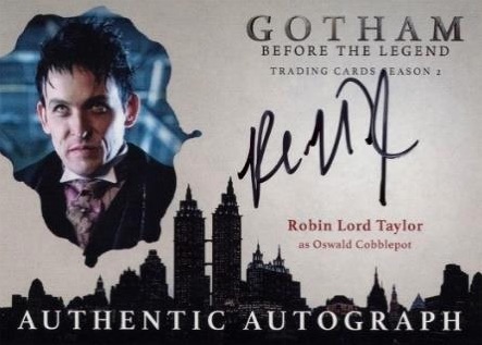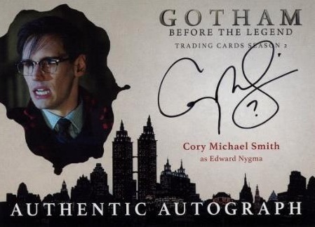 2017 Cryptozoic Gotham Season 2 also brings a direct connection to the show with on-card actor Autographs and production-used Wardrobe Relics. One of each premium insert comes in every hobby box. More limited are the Dual Wardrobe and Triple Wardrobe Relics inserts that combine multiple swatches on the same card.