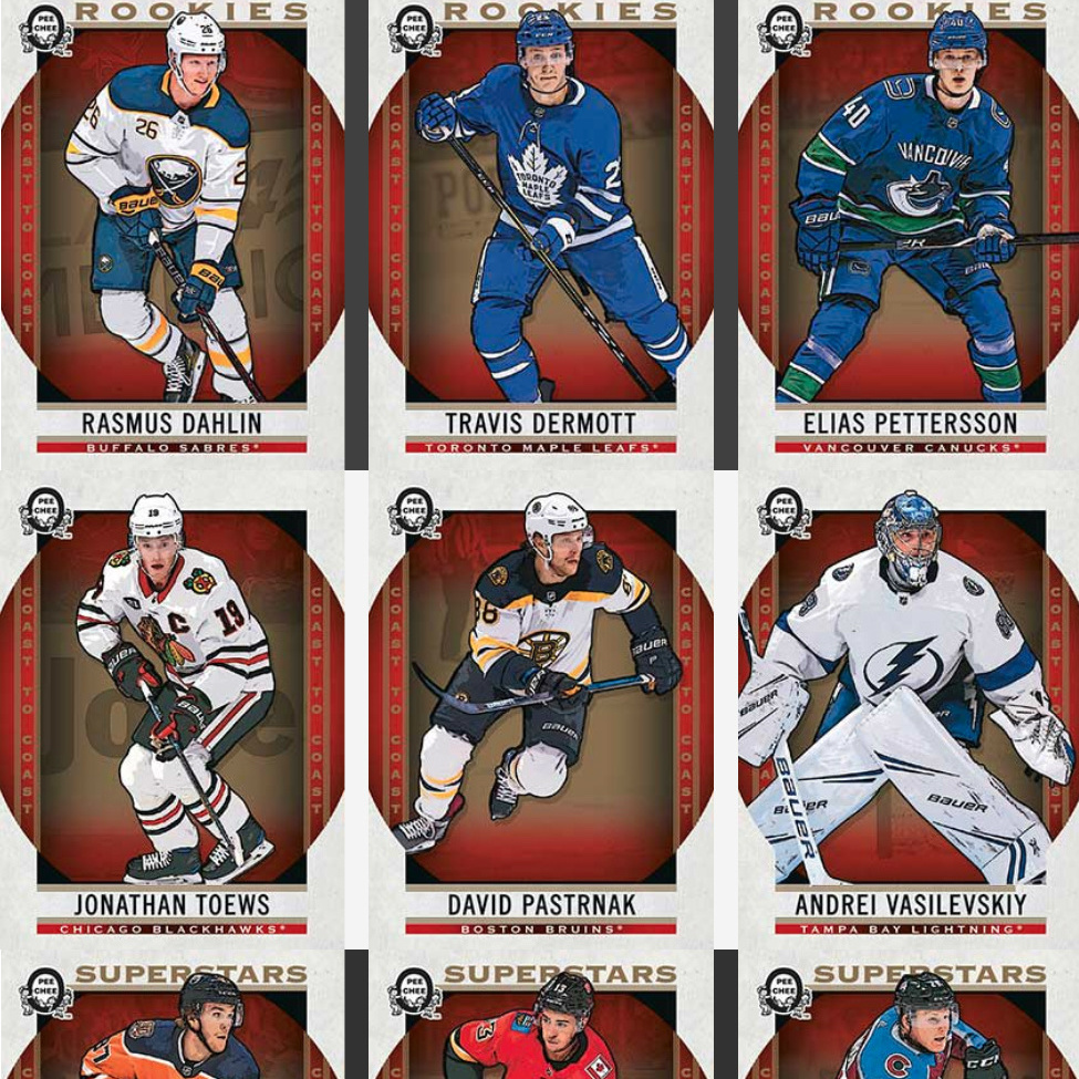 The 2018-19 O-Pee-Chee Coast to Coast Canadian Tire Hockey checklist features 100 cards in the base set, with another 50 Superstars short prints (SP), 40 Rookies super short prints (SSP), and 20 Legends super short prints (SSP). This brings the grand total to 210 cards in the main set.