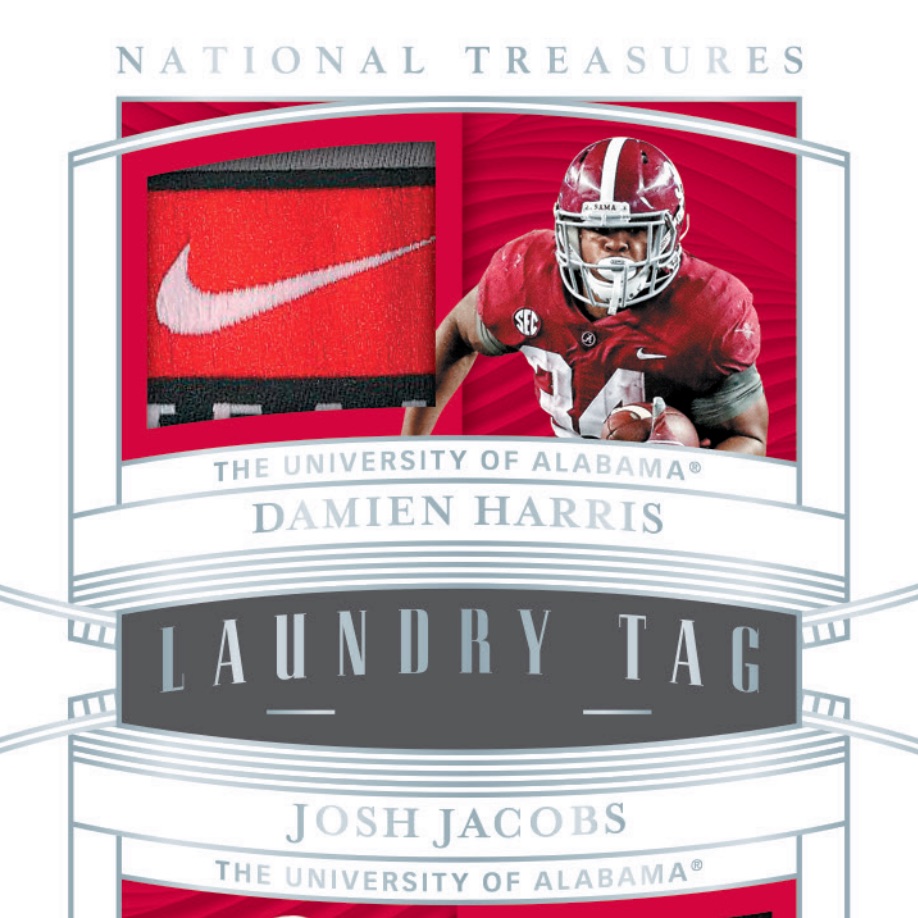 There are many relics to find in 2019 Panini National Treasures Collegiate Football, as well. The striking Laundry Tag Dual Logo set offers Brand Logo patches for 10 pairs of former college teammates.