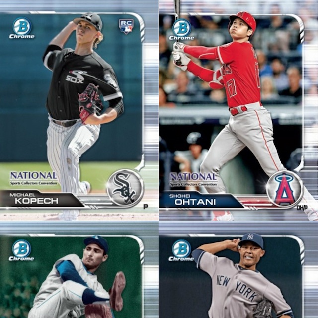 Using the main 2019 Bowman Chrome Baseball design, each 2019 Topps NSCC Bowman Chrome National Convention card displays the text logo for the National along with a unique background design some refer to as Prism.