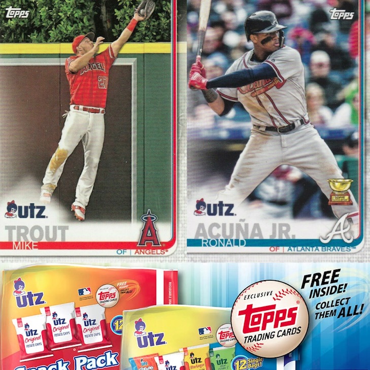 Utilizing the 2019 flagship baseball design with an added Utz brand logo, the 2019 Topps Utz Baseball checklist features 100 players. There are a few rookies in the bunch, plus superstar Mike Trout as well as Rookie Cup cards for Juan Soto, Ronaldo Acuna Jr. and Shohei Ohtani.