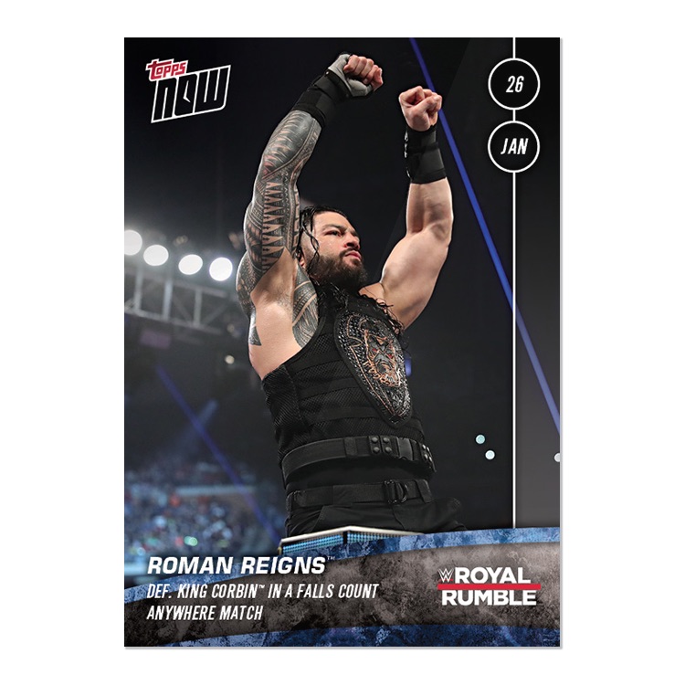 Like most of the other Now cards, the Now WWE cards are usually made available within a few days after the event has taken place. They generally come in small groups centered around a specific event, such as Royal Rumble, which leads off the 2020 Topps Now WWE Wrestling checklist.