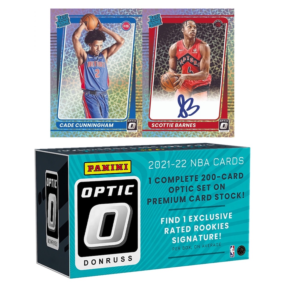 2021-22 Donruss Optic Premium Box Set Basketball puts the main Donruss Optic NBA series on exclusive card stock and adds one rookie autograph per box.