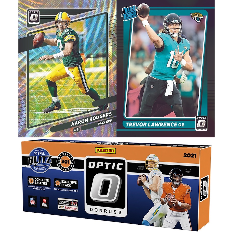 2021 Donruss Optic Football Premium Box Set features cards printed on exclusive stock done in a Refractor-esque Wave finish.