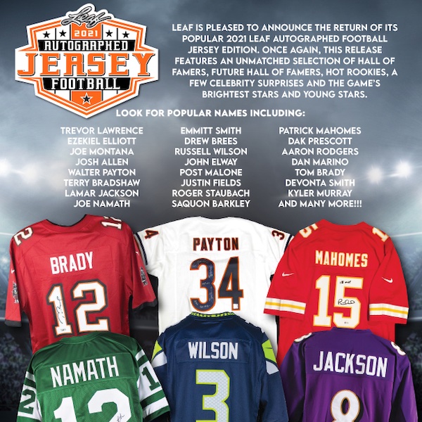 Highlighting former greats, including multiple Hall of Fame names, as well as top NFL stars of today, and the latest rookies, 2021 Leaf Autographed Football Jersey Edition lets collectors chase signed gear from some of the most popular players.