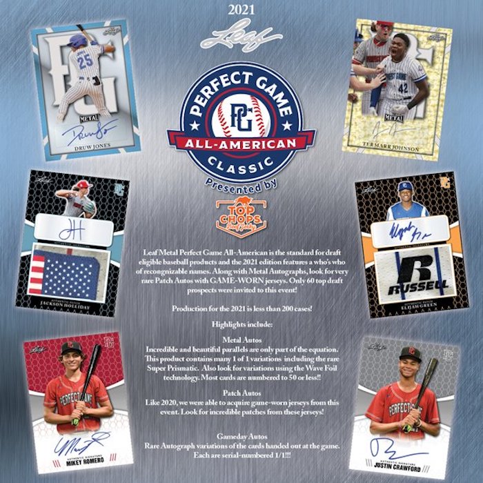 Looking at many top names, 2021 Leaf Metal Perfect Game All-American Classic Baseball highlights 60 high school stars from the 2021 PG All-American Classic.