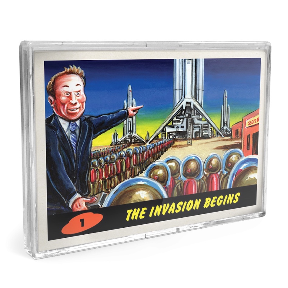 Tying into Elon Musk's assertion that humans will land on Mars in just a few years, the 2021 Topps Mars Attacks Invasion 2026 cards imagine another Earth vs. Mars battle. Of course, human beings are the invaders this time.