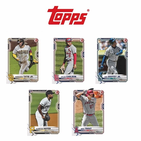 The 2021 Topps NSCC Bowman National Convention set borrows the 2021 Bowman Baseball design and adds the National logo. Fans can look forward to former greats, current stars, rookies and top prospects in the lineup.