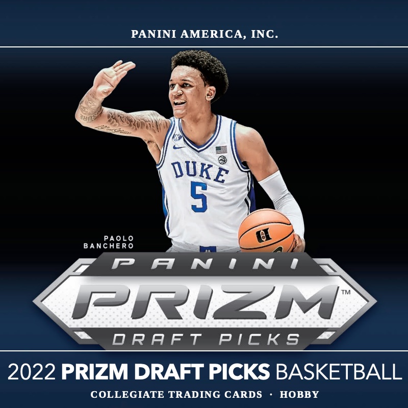 Covering multiple schools, the base set for 2022-23 Panini Prizm Draft Picks Basketball includes 100 cards. Each Hobby box should contain four base Silver Prizms and eight additional parallels.