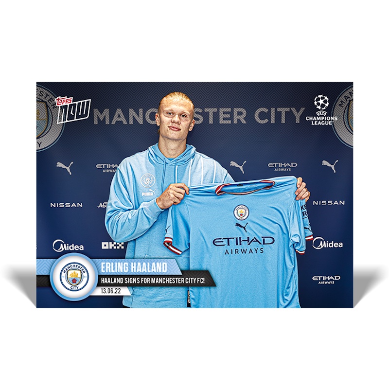 Just like last year, 2022-23 Topps Now UEFA Champions League begins with preseason cards that document new signings ahead of the action. Erling Haaland leads the way this time.