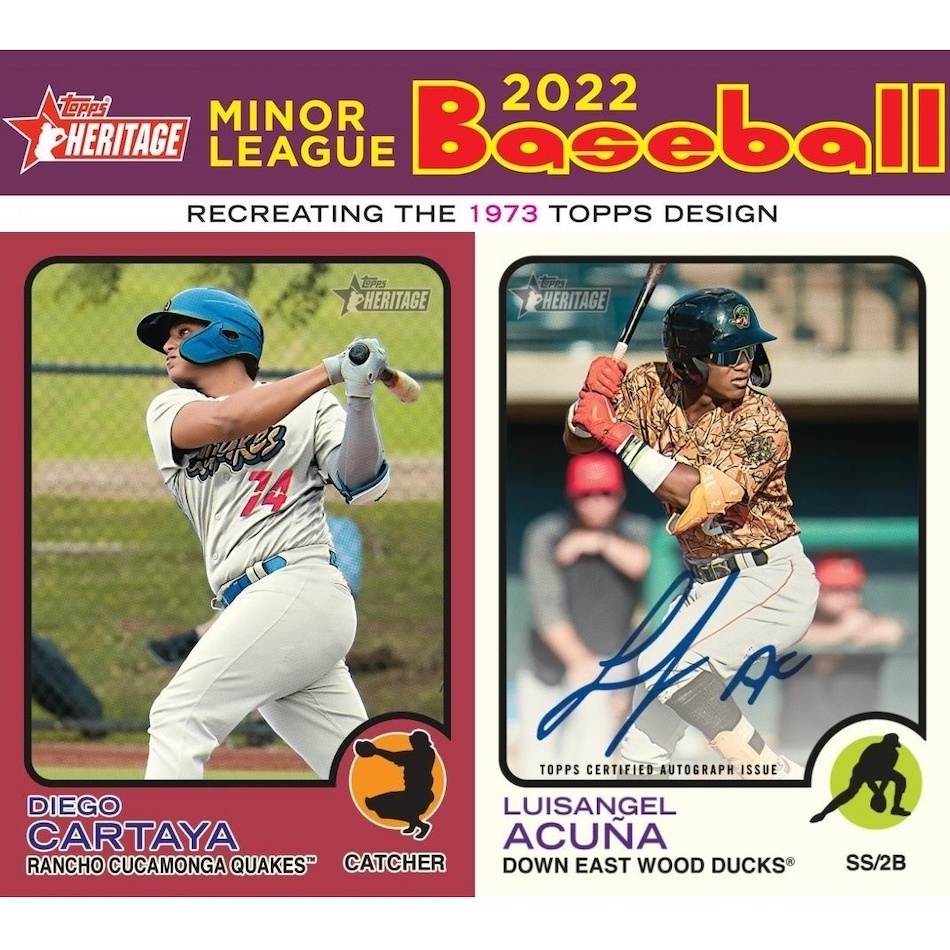 Honoring the 1973 design, the base set for 2022 Topps Heritage Minor League Baseball includes 200 cards, with subsets for League Leaders and Prospect Stars.