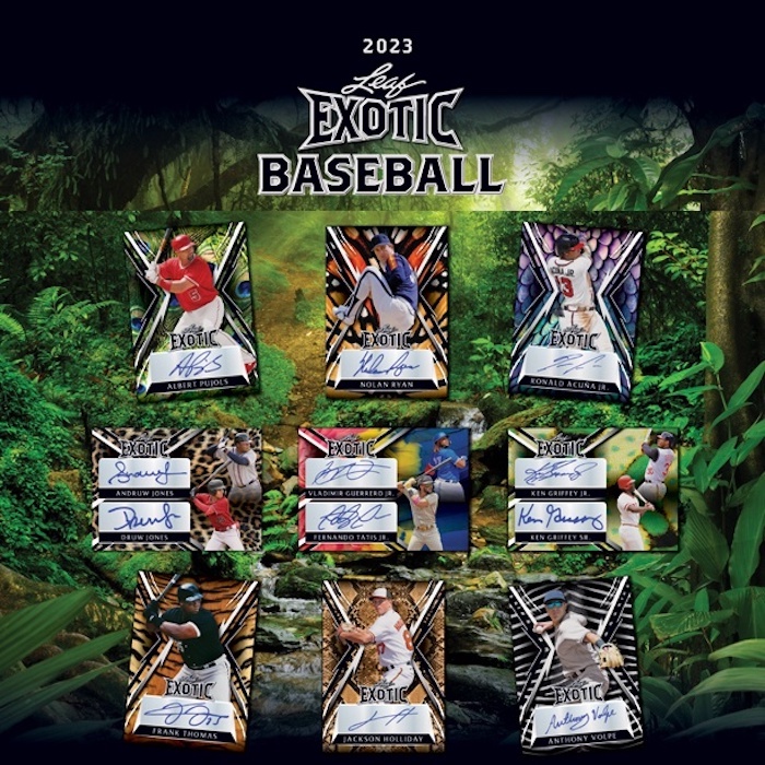 2023 Leaf Exotic Baseball offers the debut product for the sport. Each box contains three autographs numbered to 10 copies or less.