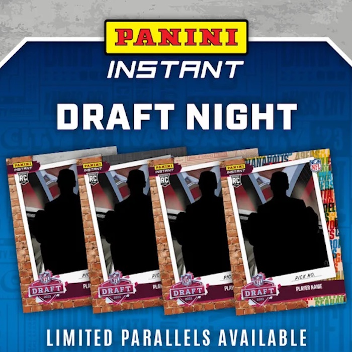 The 2023 Panini Instant NFL Draft Night Football checklist covers key players with base cards and serial-numbered parallels. Total production for the base cards is limited to the amount sold during the period.