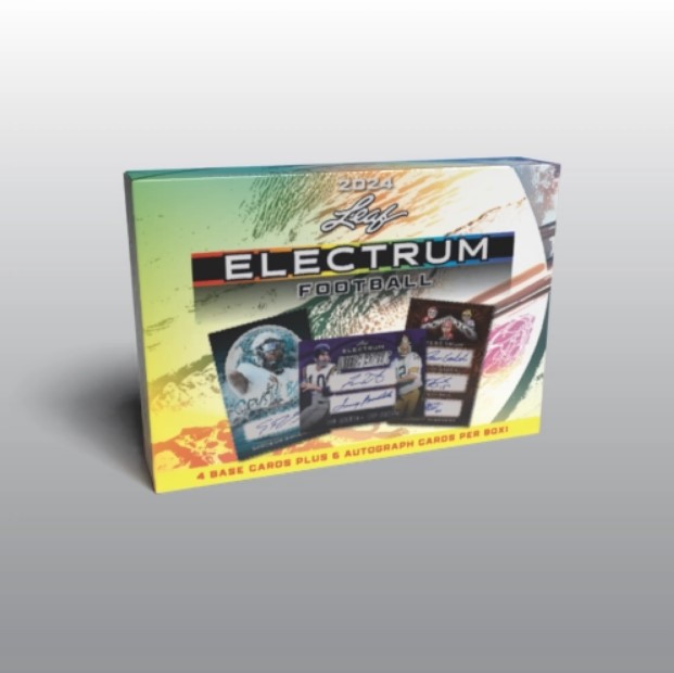 The 2024 Leaf Electrum Football card set presents a striking combination of aesthetic design and premium collectibility for football card enthusiasts. The packaging hints at a dynamic and colorful card set, featuring autograph cards from top-tier football athletes. Here's a closer look at what you can expect from this product: