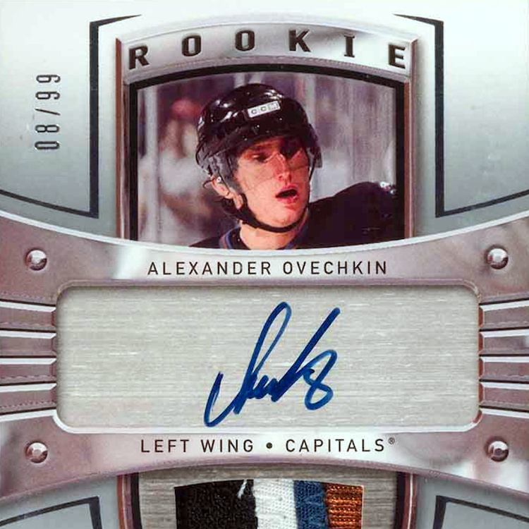Owning the top spot by a large margin, 2005-06 The Cup brings a very elaborate Ovi rookie card. Like the Ice card, it's limited to 99 copies, adding an on-card signature and jersey swatch. These high-end Alexander Ovechkin rookie cards sell for huge sums.