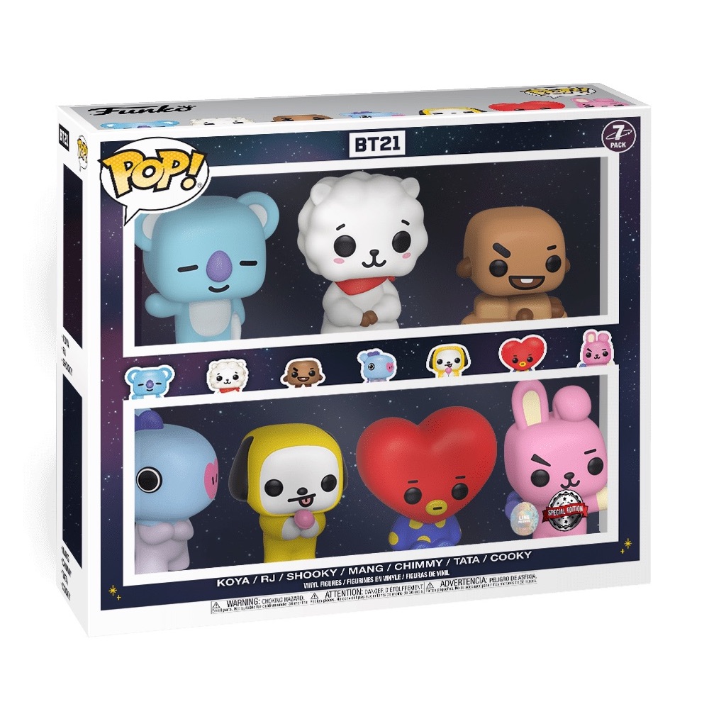 The Universtar BT21 characters featured in the vinyl set were originated by BTS through a collaboration with Line Friends. The entire seven-member group is also part of the Funko Pop Rocks line.