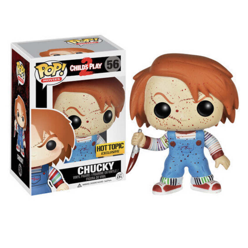 Funko Pop Chucky begins the horror series with the Child's Play 2 figure version of the "Good Guys" doll. A freckle-faced Chucky wears blue overalls over a rainbow-striped shirt. The Hot Topic exclusive variant adds some blood and both versions wield a silver knife.