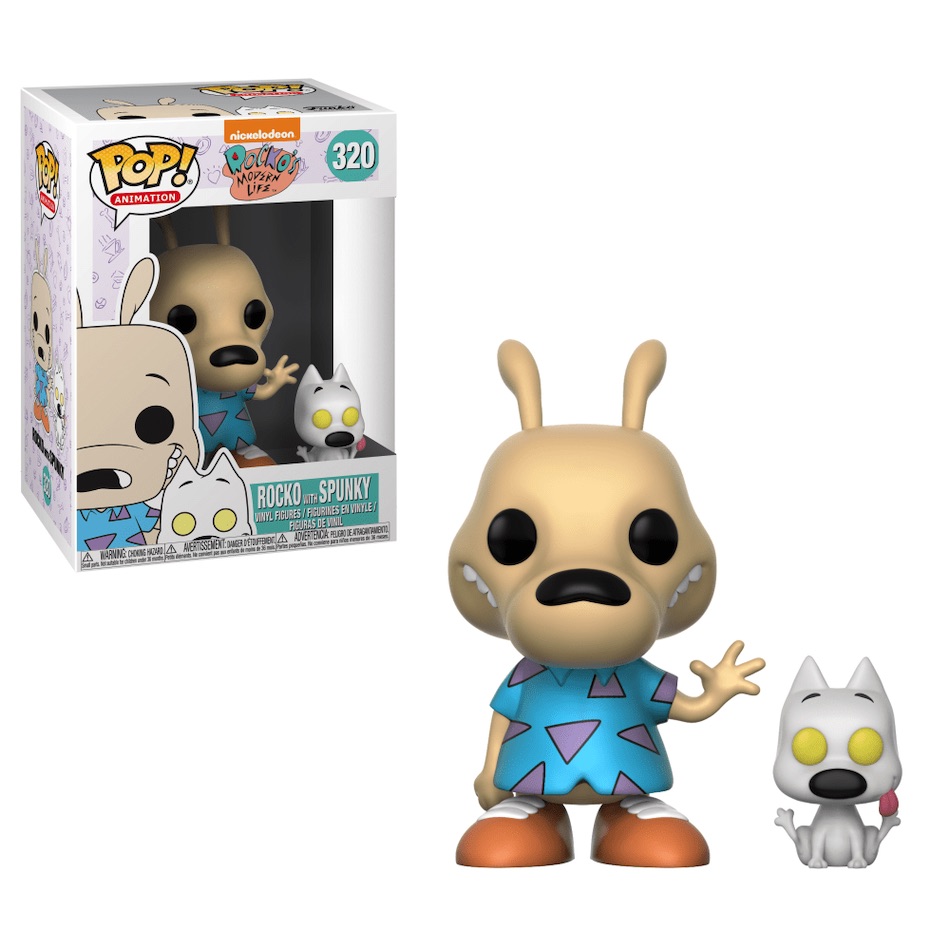 A '90s Nickelodeon cartoon, Rocko's Modern Life documents Rocko, an Australian wallaby, and his dog, Spunky, as they transition to life in the States. Funko Pop Rocko's Modern Life offers both Rocko—sporting a blue shirt with purple triangles—and his Bull Terrier in the same box. Rocko's friend Heffer, a yellow bull with a green cowlick, wears red pants with teal suspenders.