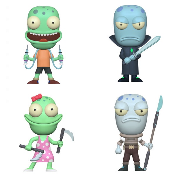 The sci-fi show features an alien family residing in America. Among the Solar Opposites figure choices, clearly-excited (and green) Terry (Thomas Middleditch) is happy to be on Earth while scientist Korvo (Justin Roiland), gray/blue and grasping a sword, would rather be anywhere else.