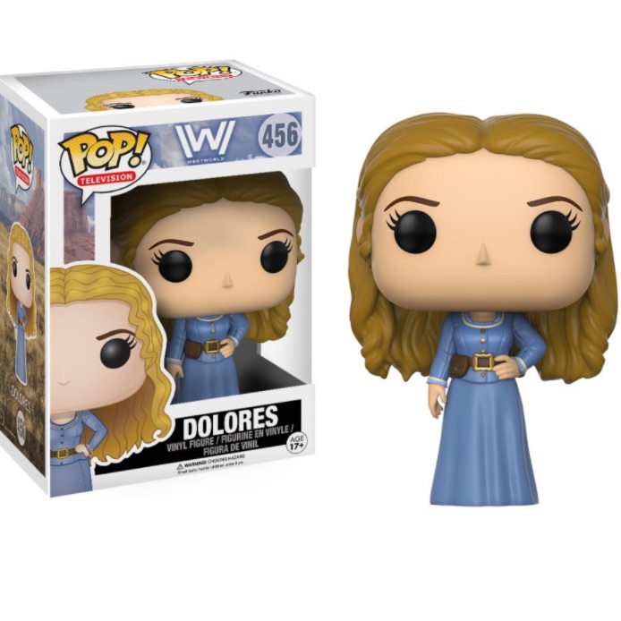 Included in the Pop! Television line, Dr. Robert Ford (Anthony Hopkins), the man behind the Westworld park, leads the lineup with his white-haired figure impeccably portraying his human counterpart. Legs slightly apart and holding a book, the mysterious co-founder is wearing a white dress shirt under the western-style black vest with matching slacks and loafers. Dolores (Evan Rachel Wood) is dressed in a dull blue shirt and matching skirt accented with a dark brown and brass belt. In contrast, Maeve (Thandie Newton) wears a hot pink corset, black lace miniskirt, and pearl earrings, with a drink in hand.