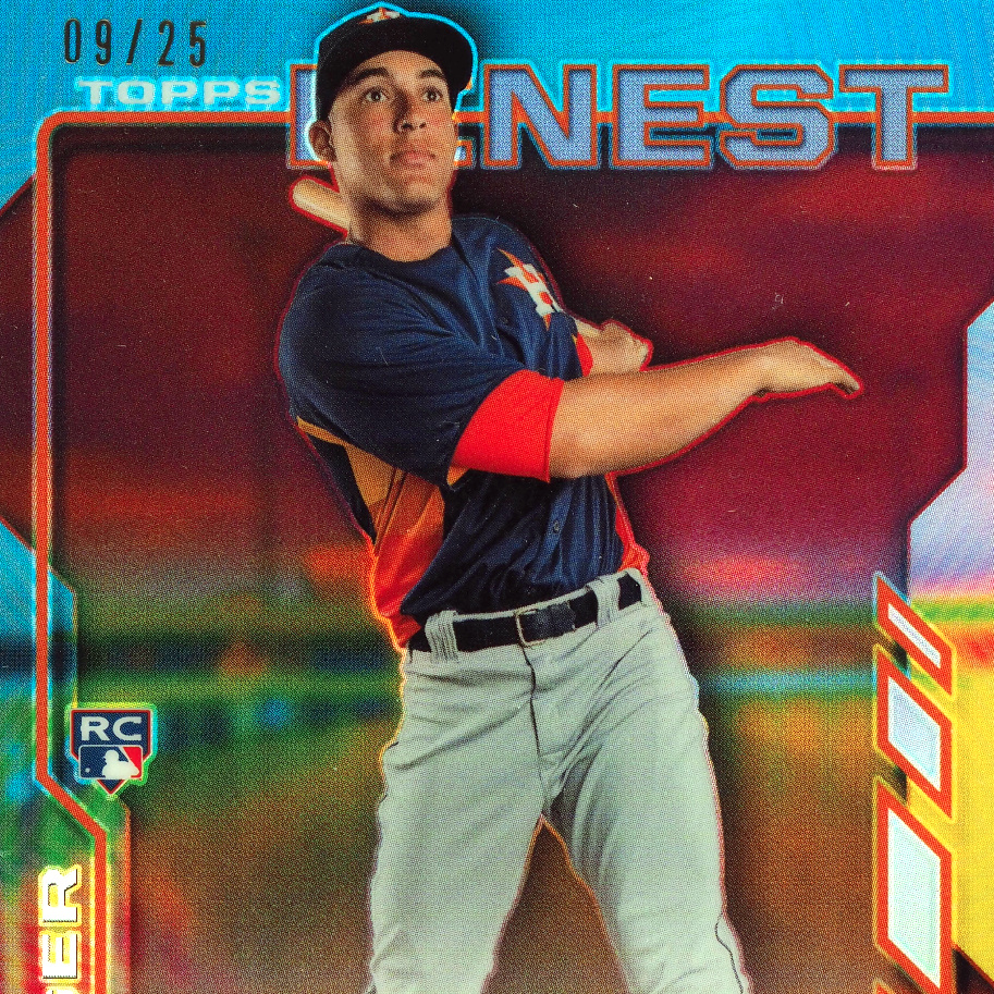 Admittedly, this is not the best card design. The image chosen was from the end of a swing, which leaves a tiny portion of Springer's face visible. Also, the foil sticker used is anything but subtle and makes it painfully clear when the sticker is not placed on the card correctly. However, this USA Baseball card from Bowman Chrome came as a wrapper redemption and is numbered to 99. The rarity adds to the appeal and this is also one of the first autographed George Springer cards. A black parallel, numbered to 25, provides the highest values.