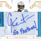 The book card includes autographs and jumbo jersey patch pieces from all 36 players who participated in the 2011 NFL Players Rookie Premiere prior to last season. On some of the cards, each player signed directly on the patch piece. They also inscribed their signature with a cheer for their team. For example, Cam Newton wrote, "Go Panthers!"