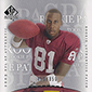 This is the most limited autographed Anquan Boldin rookie card. Serial numbered to 150 total copies, the black color scheme causes the player image to provide a striking contrast. Unfortunately, the aesthetic appeal of the card is disrupted by a sticker autograph placed directly on the photo, essentially bisecting Boldin in two.