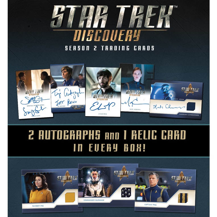 Premium hits in 2020 Rittenhouse Star Trek Discovery Season 2 combine to fall three per box. This includes signed cards averaging 1:12 packs from a selection that consists of Autographs, Full-Bleed Autographs, Dual Autographs and Autograph Relics cards.