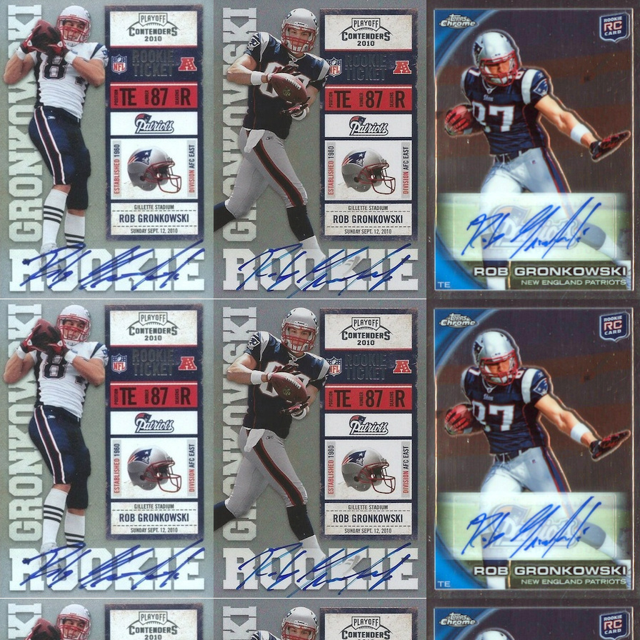 It may have a sticker autograph, but the signed edition for Gronkowski in 2010 Topps Chrome Football is another top option. The base (#/50), Black (#/25), Gold (#/10) and SuperFractor (1/1) Refractor parallels also see considerable interest. Collectors can find a limited auto patch version (#/25), as well.