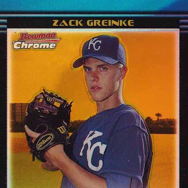 The Zack Greinke baseball cards started almost immediately after the Royals selected him in the first round of the 2002 MLB Draft. Early in his career, Greinke was a highly regarded prospect and he appeared in a wide array of corresponding products geared towards prospects, frequently as an autograph signer. As his career progressed, Greinke arrived on fewer autograph checklists, but his popularity with collectors has increased over time. Card companies have also given him a more visible presence in the hobby with an increase in the number of inserts and chase cards produced in recent years.